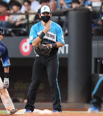 守備時に一塁送球を顔面に受けた日本ハム・野村が、マスクやネックウオーマーで口元を隠してプレーした。四回の守備で遊撃からの一塁送球がワンバウンドになり、野村のミットをかすめて顔面を直撃した。