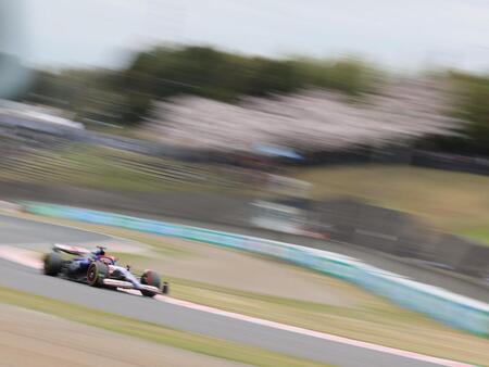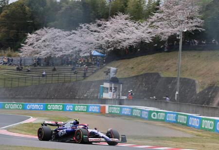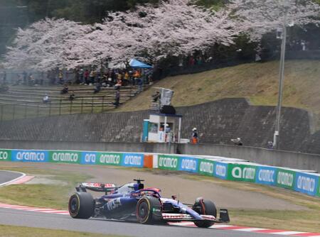 桜を背にS字コーナーを駆け抜けるRB・ホンダRBPTの角田裕毅(撮影・神子素慎一)