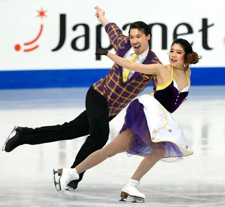 アイスダンスSDで演技する村元(右)、リード組=ヘルシンキ(共同)