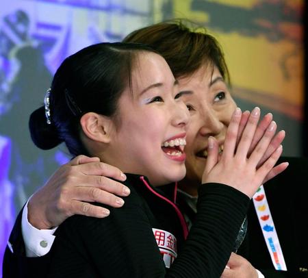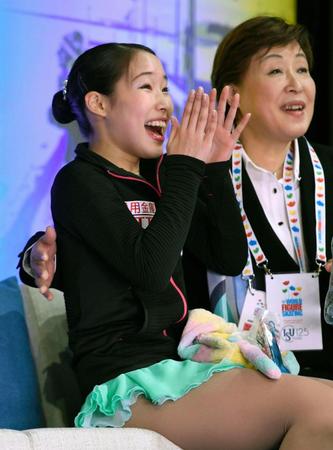 女子フリーを終え、高得点を喜ぶ三原舞依。右は中野コーチ=ヘルシンキ(共同)