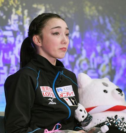 女子フリーの演技後、涙ぐむ本郷理華。16位に終わった=ヘルシンキ(共同)