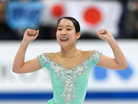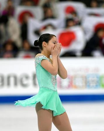 フリーの演技を終え、喜ぶ三原舞依=ヘルシンキ(共同)
