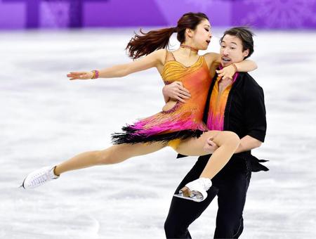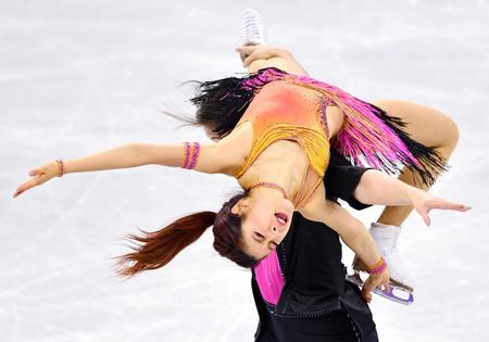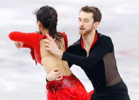 フィギュアスケート団体のアイスダンスに登場した韓国ペア。演技中に閔秀拉(左)の背中のホックが外れたが、アレクサンダー・ガメリンは衣装を押さえながら演技を続けた=江陵(共同)