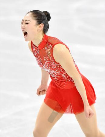 団体女子フリーを終え、喜びを爆発させる米国の長洲未来=江陵(共同)