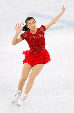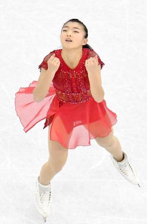 女子フリー フィニッシュする坂本花織=江陵(共同)