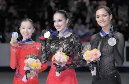 フィギュア世界選手権女子、2位はトゥルシンバエワ、1位はザギトワ、3位はメドベージェワ=さいたまスーパーアリーナ(撮影・堀内翔)