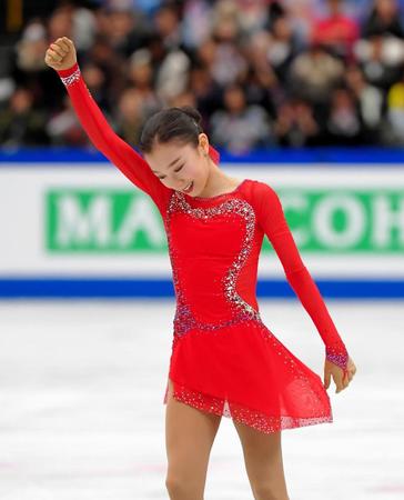 フリーでフィニッシュを決めてガッツポーズをするトゥルシンバエワ=さいたまスーパーアリーナ(撮影・堀内翔)