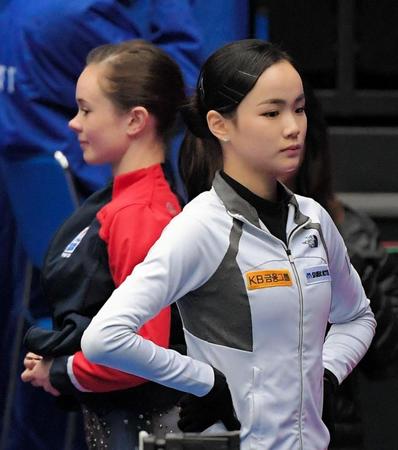 公式練習に向けてリンクサイドで準備するマライア・ベル(左)とイム・ウンス=さいたまスーパーアリーナ(撮影・堀内翔)