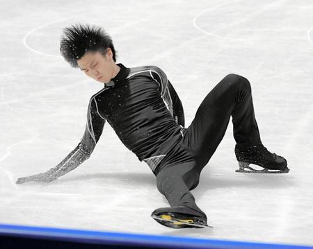 フリーに向けて公式練習で調整するジャンプの着氷に失敗する羽生結弦=さいたまスーパーアリーナ(撮影・堀内翔)