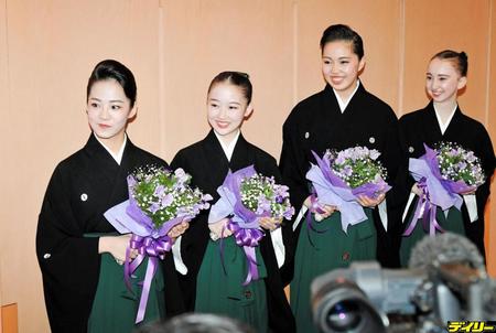 卒業生代表で会見する(左から)田中愛梨、土山はる奈、葦澤咲、ハーバード真唯=宝塚音楽学校(撮影・持木克友)