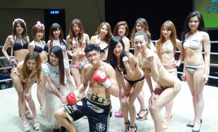 メーンイベントでTKO勝ちした前原太尊康輝と記念撮影を行うラウンドガールズコンテスト出場者