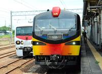 深浦駅で列車交換をする「リゾートしらかみ」の橅号(左)と青池号(右)