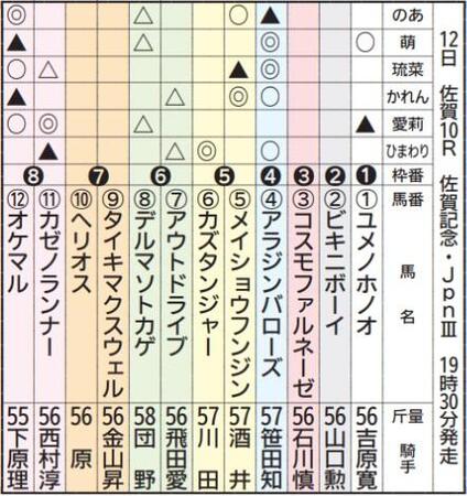 JRA勢からは、連覇を狙う昨年の覇者メイショウフンジン、佐賀出身の川田将雅騎手が手綱を取るカズタンジャーらが参戦。これを、地元・佐賀のアウトドライブやビキニボーイ、兵庫のアラジンバローズ、オケマルといった地方の実力馬たちが迎え撃つ構図だ。
